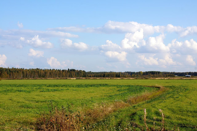Pellot ovat vihreinä ja puissa on jo ruskaa.